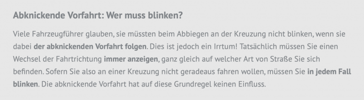 - Wenn die Hauptstraße abbiegt und ich will auch abbiegen (dem Verlauf der abbiegenden Hauptstraße folgen), MUSS ich blinken, weil ich abbiege, obwohl ich auf der (abbiegenden) Hauptstraße bleibe. Die anderen denken ja sonst, ich möchte geradeaus weiterfahren.