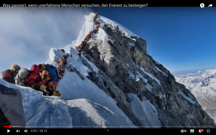 Unten ein Foto vom Mount Everest. (Keine Ahnung mehr, was die Quelle dieses Fotos ist!) Früher war der Berg mal mit seinen ca. 8848 Metern (https://bit.ly/45nZZwC) ausschließlich Extrem-Bergsteigern wie Reinhold Messner vorbehalten. Heute will und darf jeder x-beliebige Möchtegern-Kraxler da hoch, wenn er nur an die 10.000 Euro bezahlt, damit die Sherpas ihn „hochtragen.“ Einfach nur der Wahnsinn!